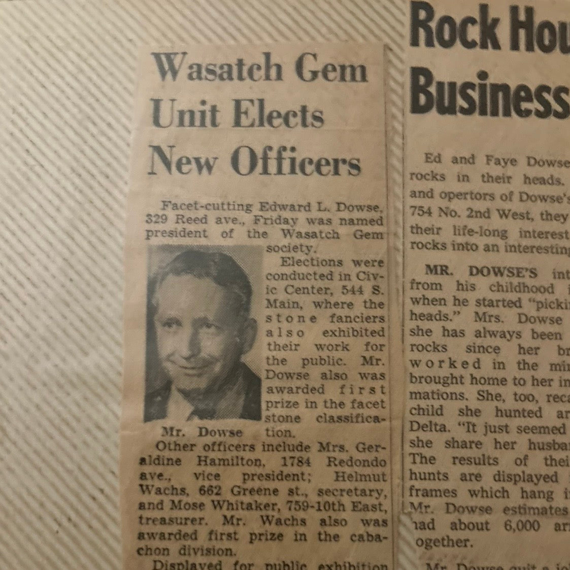 In the 1960s my great-great aunt and uncle owned a rock shop in Salt Lake City called Dowse's Rock Shop. This a vintage clipping of the news article featuring my uncle being named president of the Wasatch Gem society in 1964.