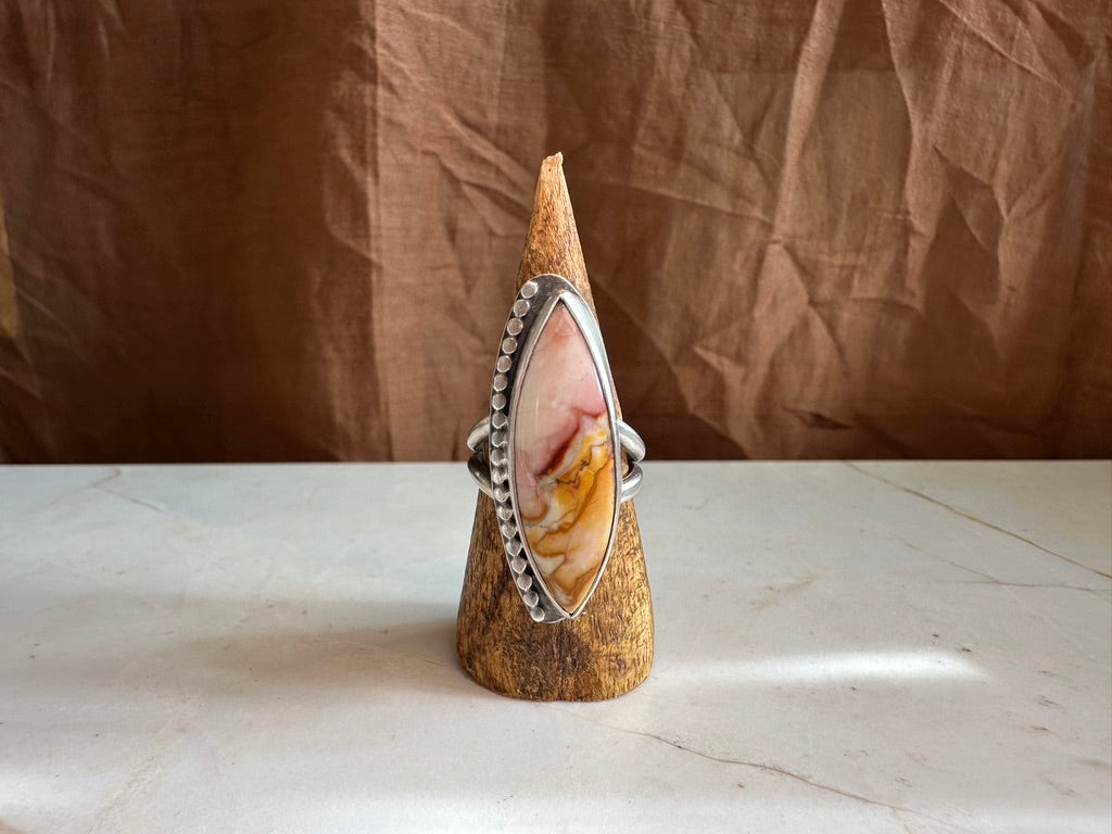 Sterling silver featuring Willow Creek jasper set on a split band. Beautifully hand cut yellow pink stone. This ring is one of a kind. Size 7.5